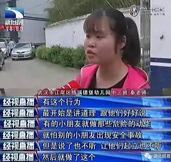 武漢市格瑞德堡幼兒園中三班共有二十九個孩子,其中有十多個孩子都說曾被副班主任秦老師要求,不聽話就自己打臉。為了核實情況,記者找到了秦老師。