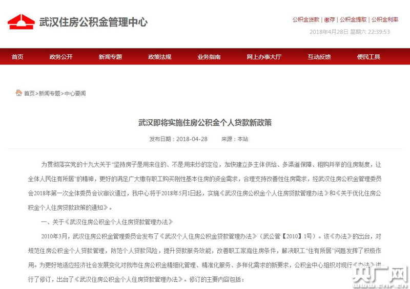 央廣網武漢4月28日消息(記者熊峰)4月28日,記者從武漢住房公積金管理中心獲悉,5月1日起,武漢將實施住房公積金個人貸款新政策,首套房基準貸款額度提高到70萬元,二套房基準貸款額度為50萬元。