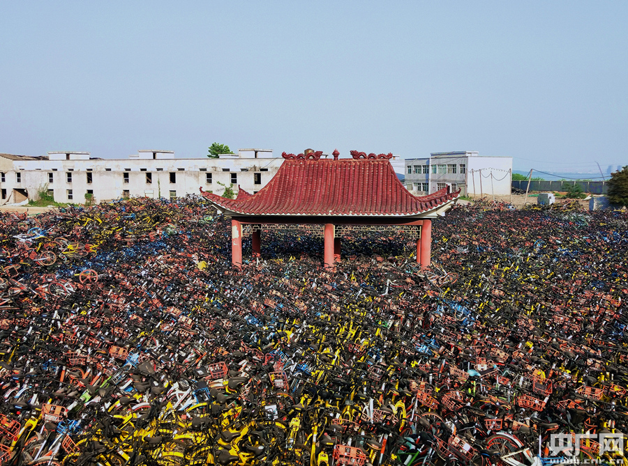 近日,湖北省武漢市洪山區世茂林嶼岸小區附近的一塊空地上堆滿了共享單車,空地中的涼亭變“孤島”。