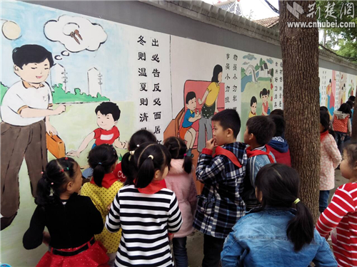 荊楚網消息(通訊員 向金莉、楊瀟)“弟子規,圣人訓;首孝悌,次謹信。泛愛眾,而親仁;有余力,則學文!币粰M一豎、一撇一捺間,《弟子規》被武漢輕工大學的大學生們“畫”到了先進小學的墻上。