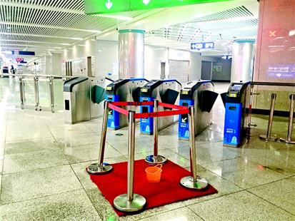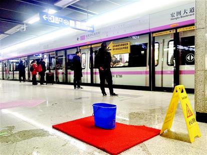 前日中午,陰雨綿綿。記者來到二七小路站,從B出口剛進(jìn)入站廳,就看到一處漏水點,地面有一點潮濕,放著“小心滑倒”的提示牌。在候車站臺處,有三處漏水點,共擺放了5個桶和盆,桶下面還鋪了一張紅色地毯,防止乘客滑倒。