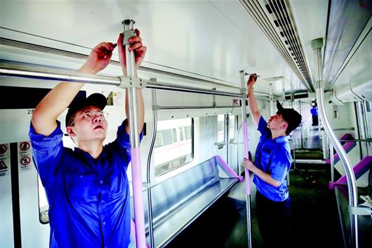 圖為8月2日,地鐵2號線首批33輛列車全部完成架修工作,重獲新生后繼續投入運營。圖為工作人員在列車內部檢修 通訊員產啟斗黃彥供圖