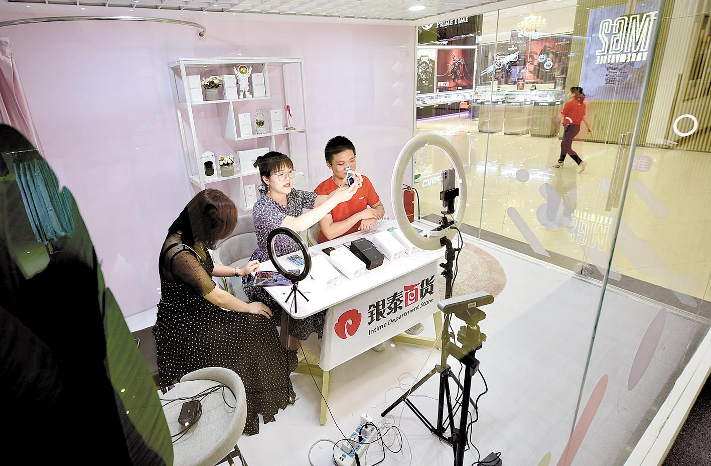 6月17日,武漢銀泰創意城共享直播間里,主播為華為手機、手表等產品進行帶貨直播!618電商大促”之際,線下商家也紛紛參與,共促武漢商業復蘇。 (湖北日報全媒記者 李溪 通訊員 唐雅倩 攝)