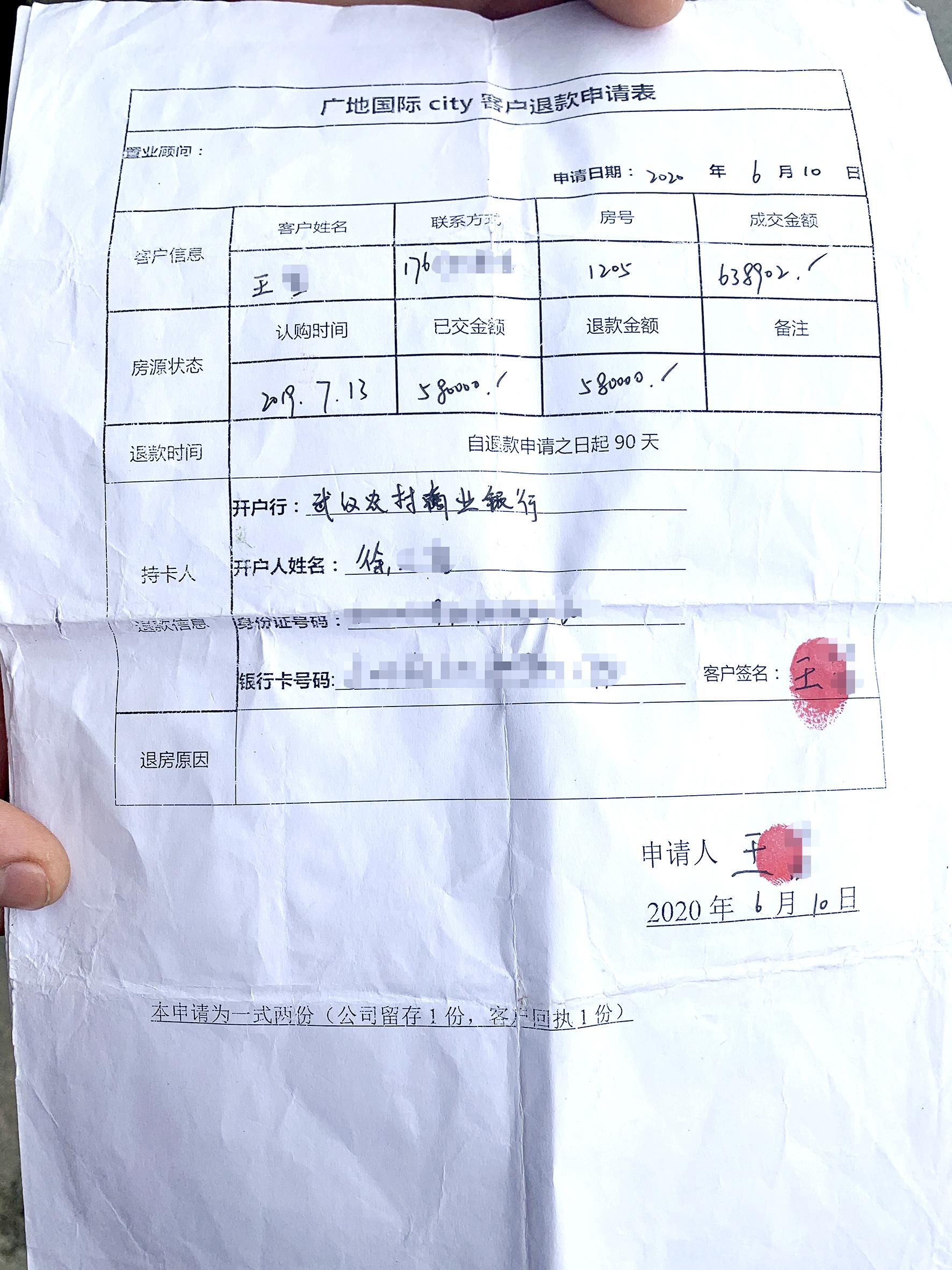 6月份,黃女士也簽下了退款申請(qǐng)表,她要求在申請(qǐng)表上蓋下公司公章。置業(yè)顧問告訴她,財(cái)務(wù)不上班,暫時(shí)不能蓋公章。超過退款時(shí)間后,黃女士曾多次聯(lián)系置業(yè)顧問,但對(duì)方一拖再拖,后來(lái)干脆不接電話。