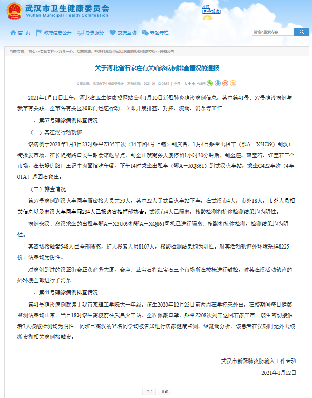 第41號確診病例就讀于我市某理工學(xué)院大一年級。該生2020年12月25日前兩周在學(xué)校未外出,在校期間每日健康監(jiān)測結(jié)果均正常,當日18時該生離校前往武昌火車站,全程佩戴口罩,乘坐Z208次列車返回石家莊市。該生密切接觸者7人核酸檢測均為陰性,同班已離漢的35名同學(xué)均被告知進行居家健康監(jiān)測。經(jīng)流調(diào)分析,該患者在漢期間無外出旅游史和相關(guān)病例接觸史。