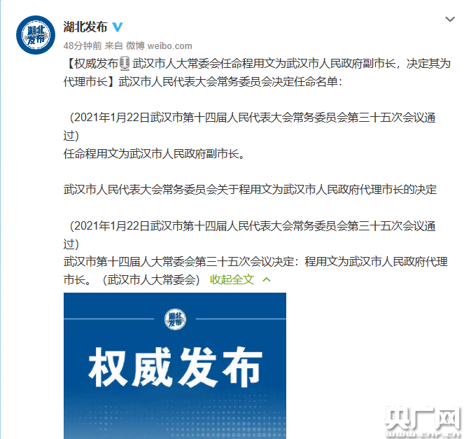 央廣網(wǎng)武漢1月22日消息(記者黃炎秋)據(jù)湖北省人民政府新聞辦公室官方微博“@湖北發(fā)布”消息,程用文任武漢市人民政府副市長、代理市長。