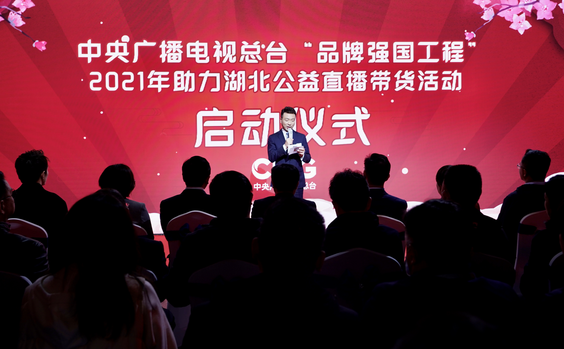 今年1月8日,中央廣播電視總臺“品牌強國工程”2021年助力湖北專項公益行動在北京、武漢兩地實時連線。中宣部副部長、中央廣播電視總臺臺長慎海雄和湖北省委書記、省人大常委會主任應勇共同啟動專項公益行動。總臺在啟動儀式中宣布,2021 年將繼續免費提供 5 億元廣告資源,助力湖北經濟恢復,提振全國消費者對“湖北制造”的信心,并為“湖北制造”舉辦 5 場直播帶貨活動,進一步推介湖北特色產品、拉動銷售。