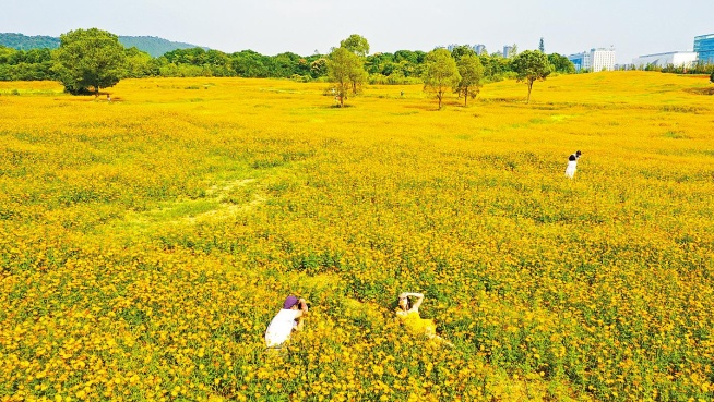 9月28日,武漢光谷中央生態大走廊最北端的九峰一路,占地近210畝的硫華菊在陽光下盛開。