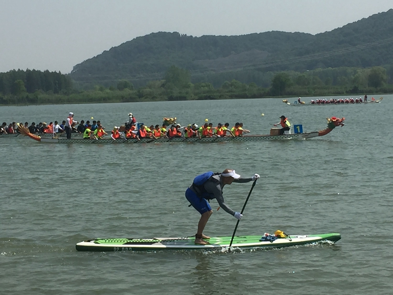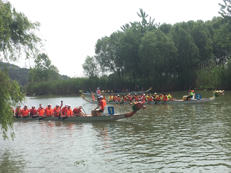 5月2日,金龍水寨和武漢野生動物王國之間的西湖,波光粼粼的湖面上,4條龍舟隨著鏗鏘有力的鼓點聲疾馳而過。湖面上運動員們動作整齊劃一,奮力劃槳,你追我趕。湖岸上觀眾的助威聲此起彼伏,與運動員們的吶喊聲相呼應。
