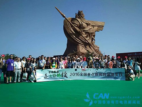 2016年千萬粉絲走進鄂旅投的媒體記者在關公銅像前合影留念