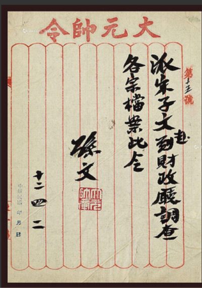 香港普藝拍賣行副主席莊志崗介紹說,這五封令文歷史價值極高,當中以兩封“大元帥令”最為珍貴,用以委任,其中一封便寫道:“任命宋子文為中央銀行副行長”。