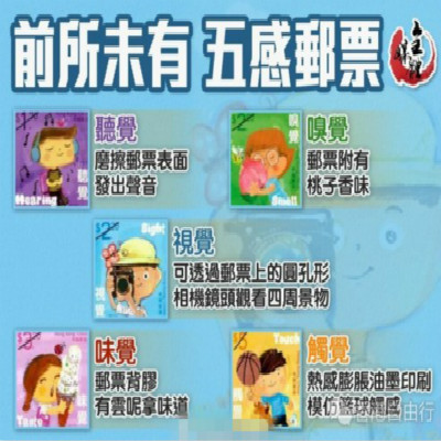 據悉,“聽覺”郵票以熱熔印刷技術把沙粒附于郵票表面,磨擦時會發出聲音;“視覺”郵票中有圓孔形相機鏡頭,可觀看四周景物;“嗅覺”郵票附有桃子香味;“味覺”郵票的背膠有香草味道;“觸覺”郵票上的籃球則采用熱感膨脹油墨印刷,模仿真實籃球的觸感。