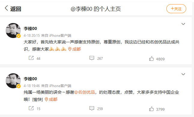 然而,很快,“戲劇化”的一幕出現(xiàn)了。18日晚間,設(shè)計(jì)師@李棟00 改口了。該名設(shè)計(jì)師連發(fā)兩條微博回應(yīng)稱,“純屬一場(chǎng)美麗的誤會(huì)”,還為名創(chuàng)優(yōu)品點(diǎn)贊,表示已和名創(chuàng)優(yōu)品達(dá)成共識(shí),并在接受媒體采訪時(shí)表示,將與名創(chuàng)優(yōu)品合作1-3年。