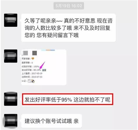 也就是說(shuō),淘寶針對(duì)賣(mài)家設(shè)計(jì)了保護(hù)機(jī)制:如果某些買(mǎi)家有“惡意投訴”的嫌疑,可以向平臺(tái)進(jìn)行反映,平臺(tái)確認(rèn)無(wú)誤之后,賣(mài)家的確可以不發(fā)貨;但是在下單時(shí),因?yàn)橘I(mǎi)家的好評(píng)率“不夠高”而無(wú)法完成購(gòu)買(mǎi)的,的確沒(méi)有這樣的規(guī)則。