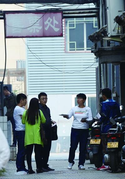 德云社劇場售票窗口前,“黃牛”(右一右二)正向觀眾薦票 攝/法制晚報記者 劉暢