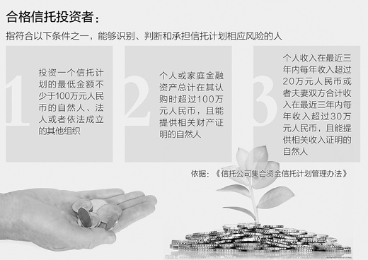 合格投資者的標準,按照《信托公司集合資金信托計劃管理辦法》規定,分為三類:一、投資一個信托計劃的最低金額不少于100萬元人民幣的自然人、法人或者依法成立的其他組織;二、個人或家庭金融資產總計在其認購時超過100萬元人民幣,且能提供相關財產證明的自然人;三、個人收入在最近三年內每年收入超過20萬元人民幣或者夫妻雙方合計收入在最近三年內每年收入超過30萬元人民幣,且能提供相關收入證明的自然人。