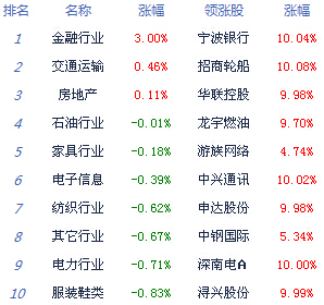 從盤面上看,銀行、券商、機場航運、港口航運漲幅居前,環保、農業、大飛機、新材料等跌幅居前。