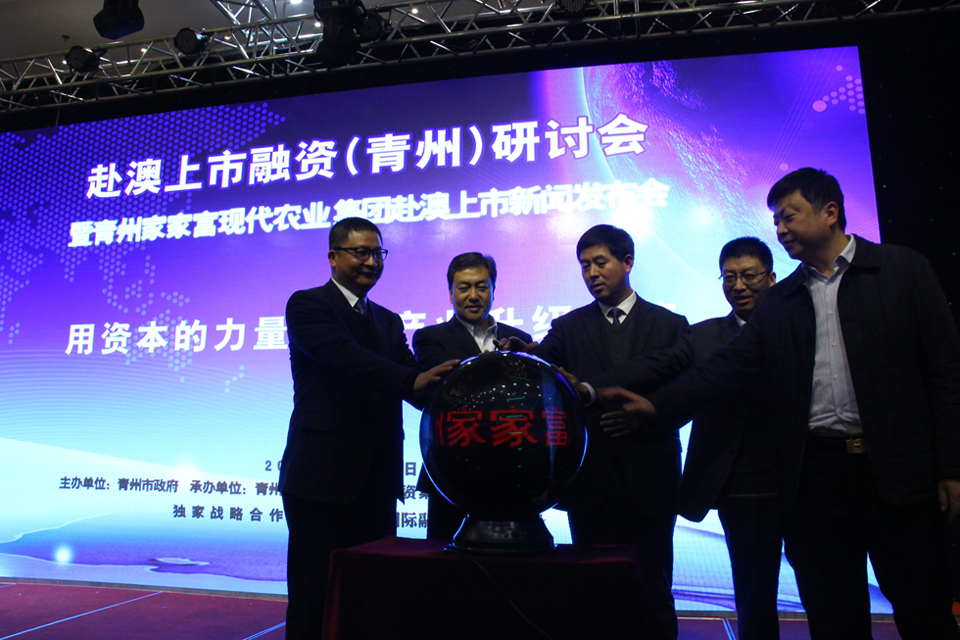 2015年3月17日,由青州市政府主辦,青州市金融辦、展騰投資集團、青州家家富現代農業集團承辦,國際融資雜志獨家戰略支持的“赴澳上市融資(青州)研討會暨青州家家富現代農業集團赴澳上市新聞發布會”在山東青州舉行。青州市各級政府領導、有關金融機構主要負責人、重點上市后備資源企業參與了此次研討會,此外,來自全國的投資人、專家學者也到會演講、交流。