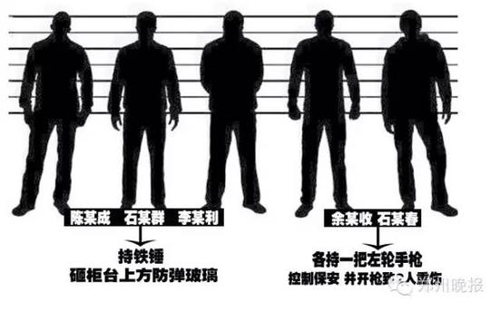 具體的分工是:余某收和石某春各持一把左輪手槍,負責控制值班的保安,并開了槍。石某群回憶,李某利和陳某成負責砸防彈玻璃,各砸了一個洞口,他接著砸,不到一分鐘玻璃砸開了,他們迅速鉆進入營業室用編織袋搶錢。