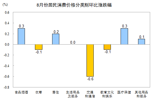8月份,其他七大類(lèi)價(jià)格環(huán)比三漲三降一平。其中,醫(yī)療保健、居住、其他用品和服務(wù)價(jià)格分別上漲0.3%、0.2%、0.1%;交通和通信、衣著、教育文化和娛樂(lè)價(jià)格分別下降0.6%、0.1%、0.1%;生活用品及服務(wù)價(jià)格持平。