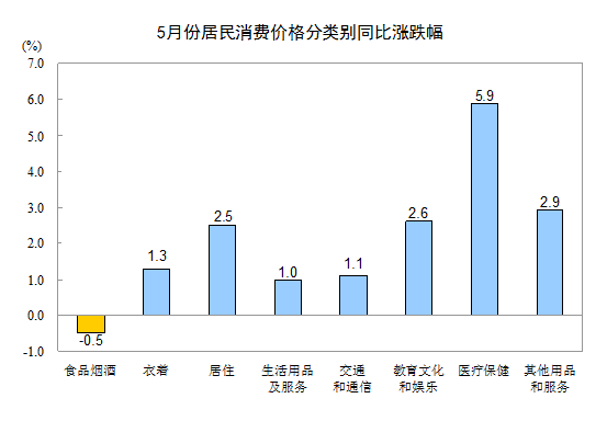 5月份,其他七大類價格同比均有所上漲。其中,醫(yī)療保健價格上漲5.9%,其他用品和服務(wù)價格上漲2.9%,教育文化和娛樂價格上漲2.6%,居住價格上漲2.5%,衣著、交通和通信、生活用品及服務(wù)價格分別上漲1.3%、1.1%和1.0%。