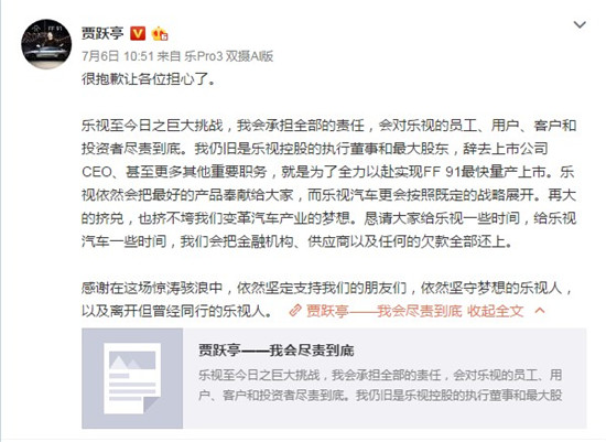 7月6日上午,樂視控股CEO、樂視網(wǎng)董事長賈躍亭發(fā)布一封個人聲明,其在聲明中稱,"會對樂視的員工、用戶、客戶和投資者盡責(zé)到底。"而之所以辭去上市公司CEO,目的在于"全力以赴實(shí)現(xiàn)FF 91最快量產(chǎn)上市",同時,"懇請大家給樂視一些時間,給樂視汽車一些時間,我們會把金融機(jī)構(gòu)、供應(yīng)商以及任何的欠款全部還上"。