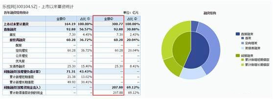 Wind資訊統(tǒng)計(jì)顯示,自2010年上市以來的近七年時間里,樂視網(wǎng)累計(jì)融資300.77億元,其中直接融資92.89億元,占總?cè)谫Y額30.88%;間接融資207.88億元,占總?cè)谫Y額69.12%。