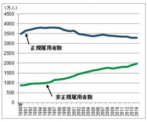 二戰(zhàn)后,日本勞動(dòng)力極度緊缺,企業(yè)由于懼怕勞動(dòng)力流失,極力吸引員工,形成了終身雇傭制,也就是所謂的“正式工”,正式工工作穩(wěn)定,基本上沒有“丟飯碗”的擔(dān)憂,而且享有許多福利。這種終身雇傭制已經(jīng)根植于日本社會(huì),而在日本泡沫經(jīng)濟(jì)崩潰后,經(jīng)濟(jì)衰退企業(yè)需要裁員,然而日本全社會(huì)對(duì)于裁員的抵觸程度比其他國家高得多,企業(yè)一旦裁員勢(shì)必會(huì)引來全社會(huì)的口誅筆伐,同時(shí)還要按照員工的工作年限給付高昂的退職金。因此,企業(yè)就開始大量的增加派遣制的非正規(guī)雇傭員工。自上世紀(jì)90年代以來,日本的正式工人數(shù)一直在下降,而派遣制員工數(shù)量則一路攀升。