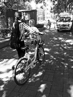 日前,記者在北京街頭遇到了一位母親,推著一輛ofo共享單車,車把上裝了一個塑料兒童座椅,里面坐著一個看上去一歲多的孩子,家長一邊走一邊和他人聊天,之后一起騎車過了馬路。