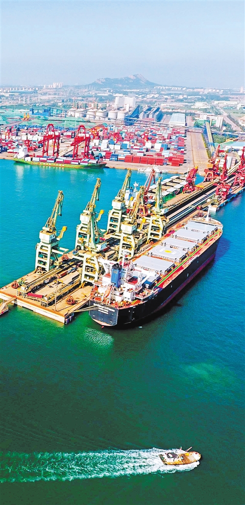 圖③ 這是2017年9月12日航拍的日照港。日照港搶抓“一帶一路”國家戰略機遇,先后開通“日照—中東”件雜貨班輪航線和“日照—中亞”集裝箱國際班列等。新華社記者 郭緒雷攝
