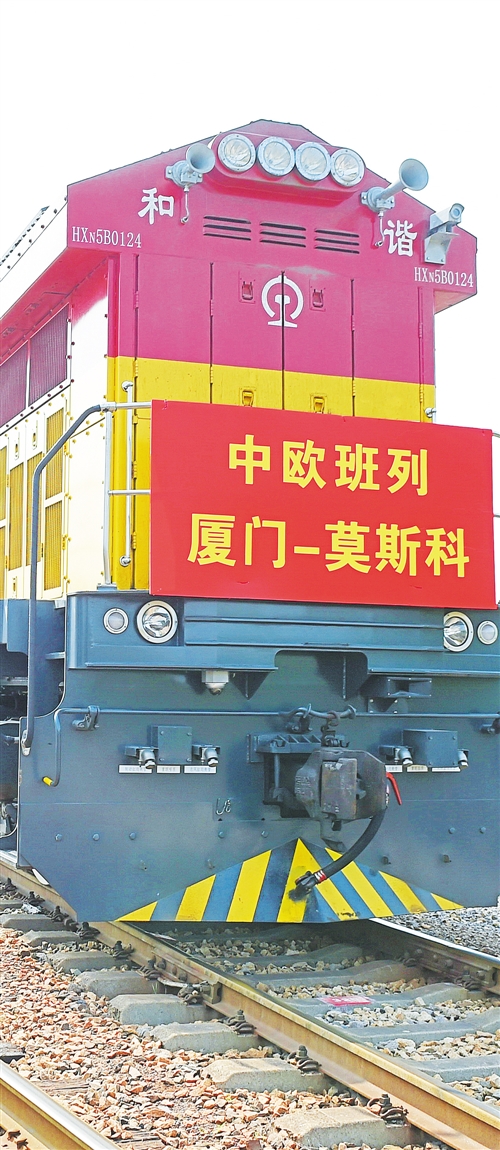 圖④ 中歐(廈門—莫斯科)直達貨運班列從廈門自貿區海滄貨場開出。 新華社記者 林善傳攝