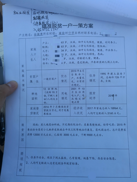 央廣網慶陽7月8消息(記者 王曉蕾)“其妻患慢性病,經常吃藥;2015年查出孫女患有小兒麻疹皮膚病,需鞏固治療,總計花費醫藥費12000元……”在甘肅省慶陽市鎮原縣平泉鎮村民徐振席家的墻上,掛著一本薄薄的“精準脫貧一戶一策方案”,里面密密麻麻詳細記錄了他的家庭基本情況、致貧原因、弱項短板、扶貧措施以及由幫扶干部為他們家制定的脫貧路徑和時間表。