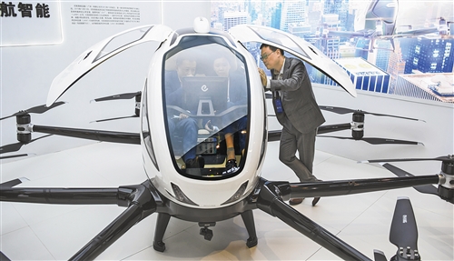 11月19日,在武漢舉辦的2020中國5G+工業互聯網成果展上,參觀者了解一臺自動駕駛飛行器。新華社記者 程 敏攝