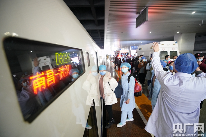 醫(yī)療隊(duì)在南昌站有序登上D3226次動(dòng)車(chē)前往武漢(肖堯 攝 南昌局供圖)