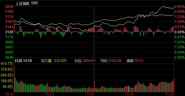 央廣網財經北京2月3日消息 據經濟之聲《交易實況》報道,兩市沖高回落。下午繼續走高。金融股暴漲,創業板迎來新紀元。截至收盤,滬指報3204.91點,上漲76.61點,漲幅2.45%,成交2834億元;深成指報11209.1點,上漲246.05點,漲幅2.24%,成交2339億元;創業板指報1750.91點,上漲54.08點,漲幅3.19%,成交540.5億元。