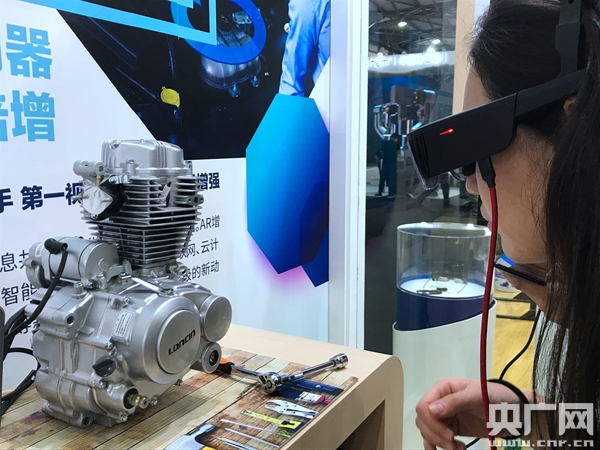 在亮風臺公司的展臺前,一個摩托車發動機格外引人注目。現場工作人員任崇斌介紹,維修人員工作時戴上亮風臺AR眼鏡,摩托車發動機的產品信息、零部件結構就能清晰地疊加在現實場景之上。“我們可以在現實中疊加顯示它的內部結構和工作原理,可以選擇各個模塊讓它告訴我們每個零部件的名字。如果在維修的過程中遇到了問題,可以申請遠程協助。這些全都是戴著眼鏡在操作,可以達到解放雙手的目的。”