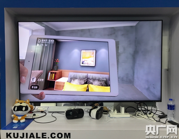 記者戴上這個VR眼鏡后,設計方案中的條紋壁紙、木地板、北歐風家具仿佛就在眼前,像是走進了剛裝修好的房間。酷家樂品牌合作專員錢天穎說:“這是一個VR的設計方案,你可以進入每個房間里感受,我們可以把所有在酷家樂平臺上面的方案一鍵切換到VR設備,直接配合這個眼鏡就可以有浸入式的感受。”