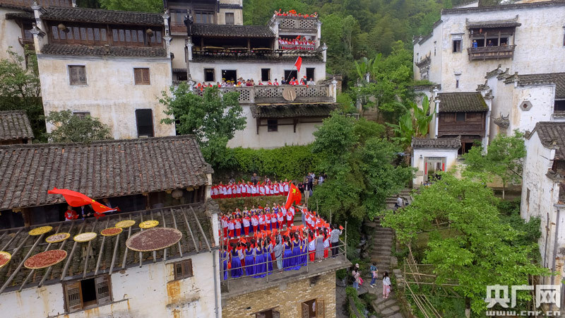 央廣網婺源4月26日消息(記者鄧玉玲 通訊員方華彬)4月25日,婺源縣江灣中心小學的師生齊聚婺源篁嶺古村共同唱響《我和我的祖國》,展示廣大師生愛祖國、愛家鄉的熾熱情懷,以昂揚的精神面貌迎接新中國成立70周年。