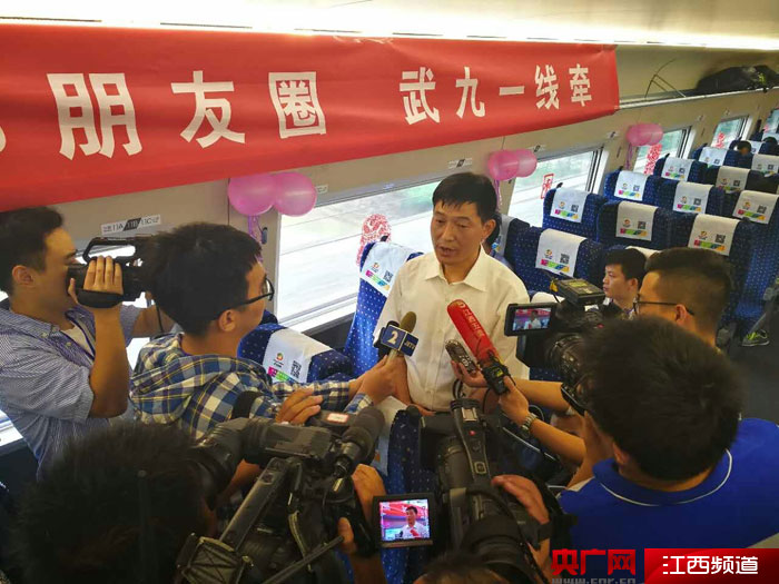 媒體記者乘坐的是G488次列車,車身呈流線型,簡單優美,還貼上了許多“厲害了 我的國”標志。上車后,昌九城際股份有限公司負責人為大家介紹武九高鐵建設情況,并表示坐上自己建的高鐵感覺非常開心、自豪。