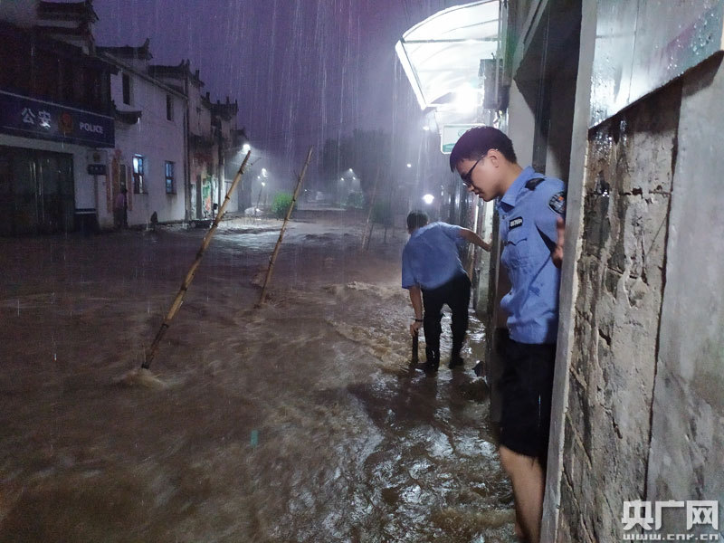 當晚7時許,沱川鄉的強降雨已持續了4個多小時,洪水造成理坑村及沿河村落被淹,村下村敬老院附近電箱損壞,學校空地被淹沒。面對突發的災情,沱川派出所立即啟動防汛處置應急預案,調集全部警力,所長張小波帶隊,奔赴災區,疏通水毀道路、搶救受災財物、轉移被困群眾。