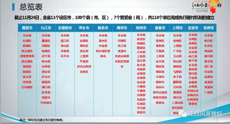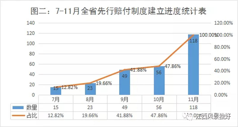 一年來,省政府及省文化和旅游廳等部門高度重視條例貫徹落實工作,先后成立了宣傳貫徹工作領導小組,及時下發了《宣傳貫徹〈江西省旅游者權益保護條例〉實施方案》,組織出版了《江西省旅游者權益保護條例釋義》,開展了“百萬網民學法律”江西省旅游者權益保護條例專場知識競賽活動,近32萬人次參與網絡答題,形成了較好的宣傳輿論氛圍。同時,各地對條例中先行賠付等重點創新條款進行了及時落實,如上饒市設立了總額1000萬元優質旅游誠信理賠基金,鷹潭市在全省率先升格組建了副縣級旅游綜合執法支隊等。截止11月24日,我省11個設區市本級、100個縣(市、區)、7個管委會(局)全部建立了先行賠付制度(見圖一)。其中,7月-11月的每月建立比例逐月攀升(見圖二)。