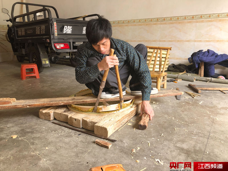 為了謀生,17歲那年,他跟著父親學做竹器。破蔑、支架、編織、固定組裝……這些體力活,李福昌干起來比常人吃力得多。干活時借助的木墩,有兩個深深的凹痕;破篾的凳子,已經用壞了十幾個。