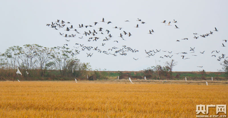 成千上萬只白鶴、白枕鶴、灰鶴在棲息覓食,嬉戲飛舞(央廣網發 通訊員供圖)
