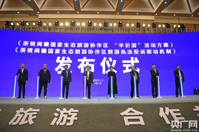 央廣網(wǎng)上饒12月1日消息(記者王一凡)為加強(qiáng)區(qū)域合作,共同推動(dòng)浙皖閩贛生態(tài)旅游高質(zhì)量發(fā)展,11月30日,2020浙皖閩贛國家生態(tài)旅游協(xié)作區(qū)推進(jìn)會在江西上饒鉛山舉行。會上,四省聯(lián)合發(fā)布了《浙皖閩贛國家生態(tài)旅游協(xié)作區(qū)“半價(jià)游”合作協(xié)議》,活動(dòng)期間,浙皖閩贛國家生態(tài)旅游協(xié)作區(qū)居民享受門票半價(jià)政策。