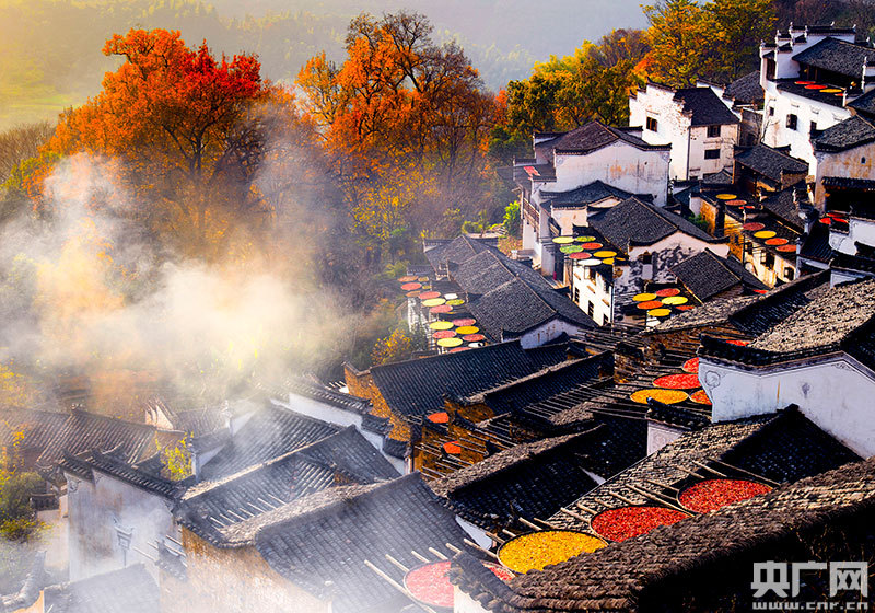 央廣網婺源9月29日消息(記者王一凡 通訊員江淦泉)眼下,正是曬秋好時節。天剛蒙亮,在婺源篁嶺景區,吳向陽和“曬秋大媽”們正張羅著怎么擺放新一天的曬圖。裊裊炊煙升起,住在篁嶺“曬秋美宿”的游客推開窗欞,架起“長槍短炮”,定格下曬秋勞作的鄉村晨景。