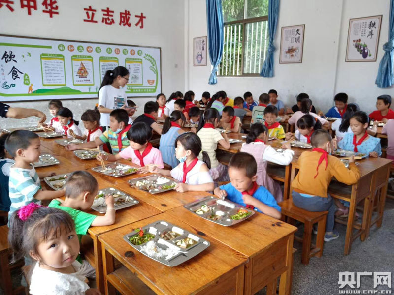 “開飯嘍!”伴隨著食堂廚師的一聲吆喝,孩子們迅速將課桌上的書本、文具收拾干凈,接過盤子和筷子,排隊到講臺打飯。老師們負(fù)責(zé)給各自班級的孩子們打飯,平時習(xí)慣在黑板上寫粉筆字的他們,打起飯來也毫不含糊,一邊熟練地將飯菜足量盛到孩子們的盤子里,一邊問他們夠不夠,鼓勵他們要吃飽。