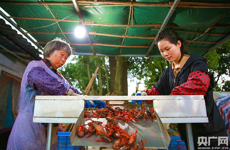 江西省吉安市吉水縣醪橋鎮元石村稻蝦共作基地,村民正在分揀小龍蝦