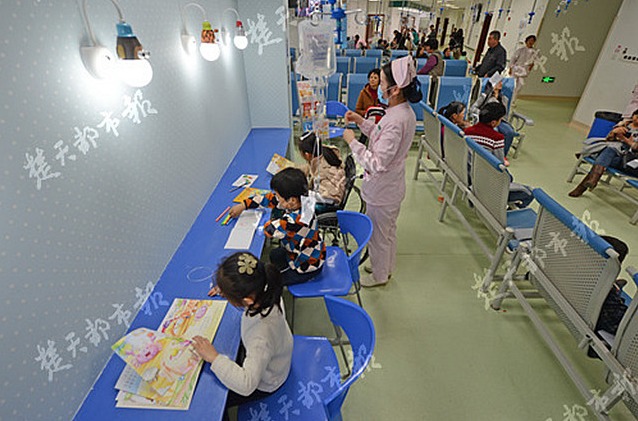 在一排可愛的驢頭護眼燈下,幾名小朋友掛著吊瓶端坐在輸液室的一角,趴在桌前或閱讀或做作業……這是武漢市第三醫院光谷院區兒科門診內的一幕。今天,該院在武漢率先開設兒科輸液室書香一角,方便學生打針時兼顧學習,堪稱醫院里的“吊瓶班”。