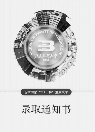 北京工業大學今年專門請來該校工業設計專業學生設計通知書。在通知書封套正面,北工大的科學樓、第二教學樓、圖書館等標志性建筑圍繞校徽呈圓形排列,遠遠看去,猶如盛放的花朵,底紋則是北工大藍顏色的豎條紋,看上去端莊素雅。今年校園開放日期間,北工大還組織了“VIP家長團”,邀請前來參觀的家長為自己的孩子寫封信留在招辦。如果孩子成功考上北工大,這封信將連同錄取通知書一同寄出,成為他考上大學后的第一封家書。