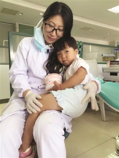 “別哭,奶奶抱!”就在這時(shí),囗腔診室主任醫(yī)師孔銳伸出了雙臂,溫柔地招呼她走過(guò)來(lái)。同時(shí)孔主任從桌上拿了一個(gè)牙齒模型玩具遞到她的手中,并趕緊解開了口罩,讓小女孩看見她慈愛的表情,親切地笑著再次向她伸出雙臂。